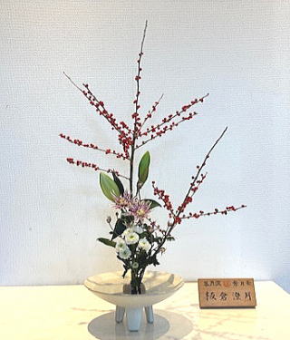 【花月流】 板倉 澄月 花材…梅擬、百合、菊、雀舌、小菊、 オリエンタルリリー |