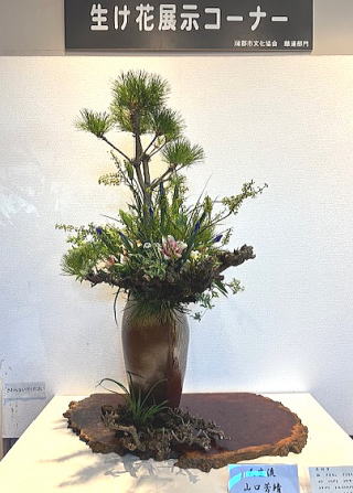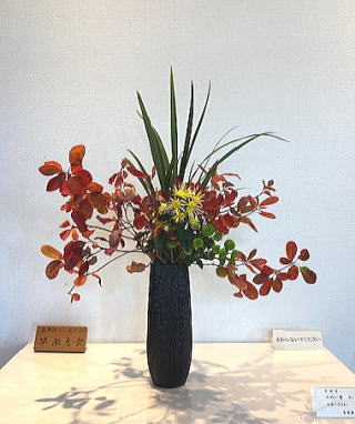 | 【真生流】 市川 洸華 花材…もみじ、菖蒲、センダイ萩、 ギボシ(寒河江) |
