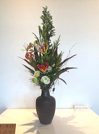 | 【花月流】 本多 尚雲 花材…杉、赤ドラセナ、黄金ヒバ、グロリオサ、 トルコ桔梗 |