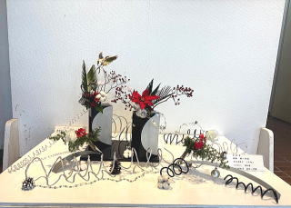 【草月流】 竹内 紅美 | 【小原流】 浅井 彗雲 花材…白つる、アンスリウム、ノイバラ |