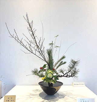 | 【池坊】 中瀬 京子 花材…梅、椿、松、竹、小菊、水仙、金柳、 老梅、千両、葉ボタン |