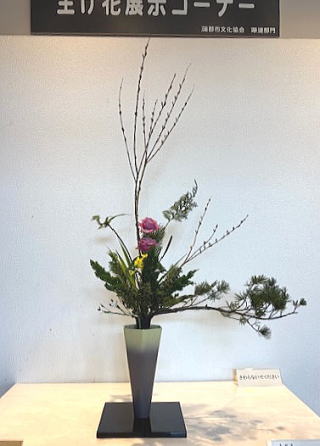 【池坊】 山本 紀美代 花材…ひのき、つばき、いぼた、なでしこ、 あずき柳、しゃが、ごよう松、つげ、 ばら、すいせん、若松、ぜんまい |