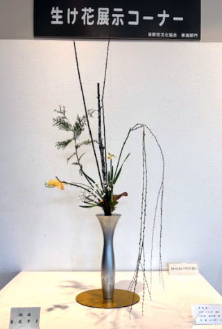 | 【池坊】 三浦 千恵子 花材…イヌコリヤナギ、ヤツデ、バラ |