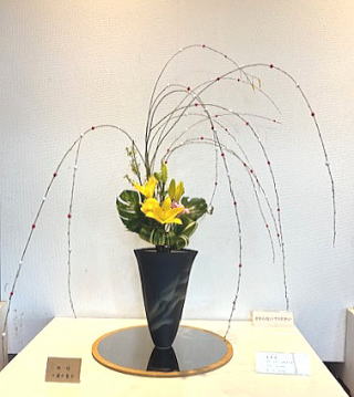 【池坊】 三浦 千恵子 花材…ユリ、バラ、シダレヤナギ、ハラン、 モンステラ、ガーベラ、アオモジ |