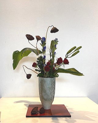 | 【花月流】 板倉 澄月 花材…キビ(玉すだれ)、八重百合 竜胆、鶏頭、 ドラセナゴッドセフィア |