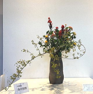 | 【池坊】 小田 二三枝 | 【小原流】 浅井 彗雲 花材…けいとう、紅花、つる梅もどき、 黄色ホトトギス |