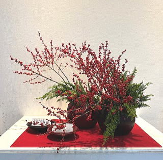 | 【花芸安達流】 稲石 雅曈 花材…セイヨウウメモドキ、クジャクヒバ |