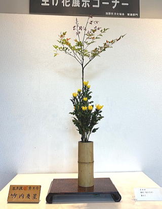 | 【真生流】 市川 洸華 花材…もみじ、菖蒲、センダイ萩、 ギボシ(寒河江) |